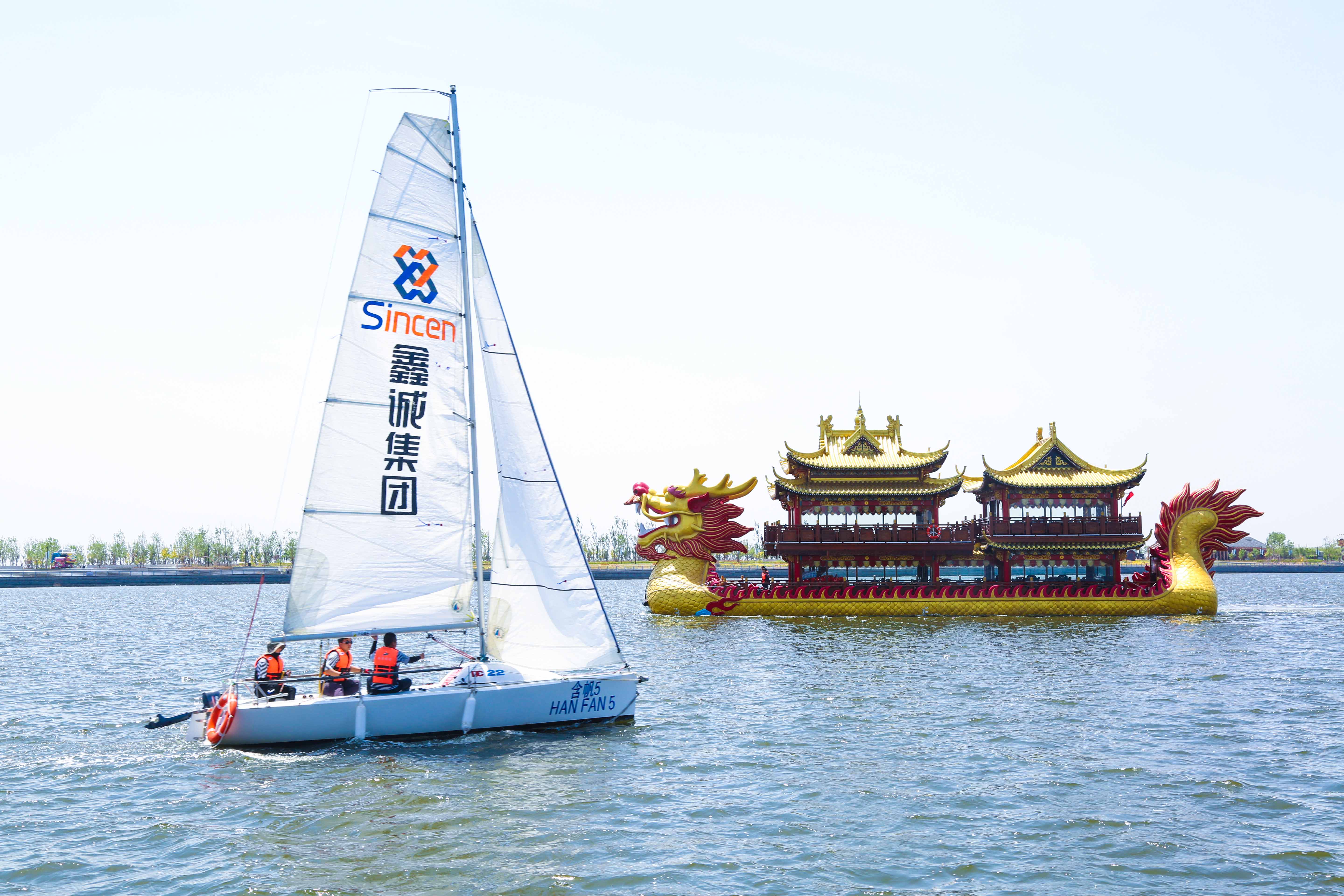 龙船,船长均为27.7米,宽度7.5米,高度8.5米,能同时容纳88位游客同时乘坐。金色的龙头面目和善蕴意祥和之兆,俏丽得龙尾冲天而立蕴意盈稳之征,飞檐翘角的仿古风格,精细的雕梁画栋。船上盘龙柱子、彩画、龙柱上的浮雕盘龙和祥云层层错落有致,雕刻精细到盘龙身上的每一个鳞片都细细可数,船尾的雕花栏杆与船舱、船头的雕刻遥相呼应,彰显富贵华丽,这艘“北方巨龙”传承了我们龙的传人世代对龙的信仰精神。她得全名称之为:“仿南宋御用龙舟”,是东北第一艘龙船,被称为“东北第一龙”。